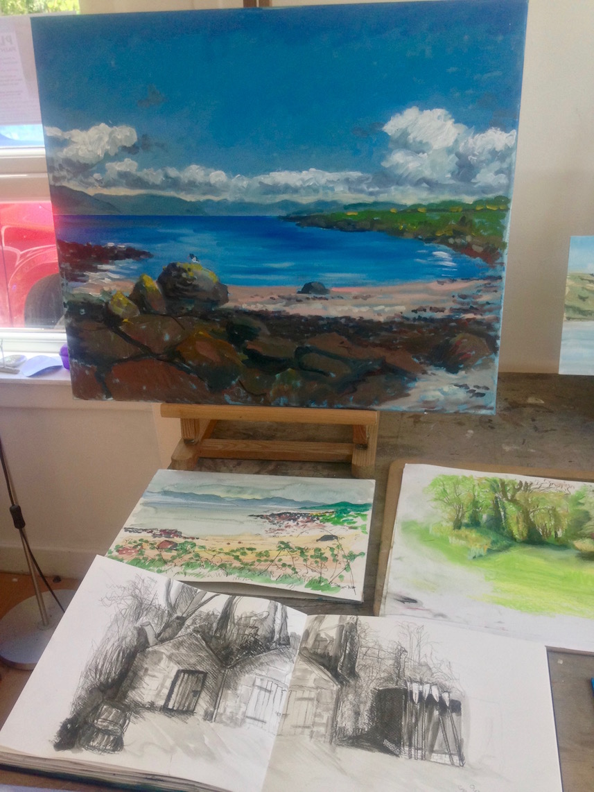 The event is called Plein Air Weekend. It’s an opportunity for artists, both local and further afield, to paint or sketch in a beautiful place with support at hand. Although it was a two-day session, I only managed one as I had another art event the following day in Glasgow. But next time I fancy popping over to sketch and cycle there’s always a bed for the night at the Cathedral of the Isles itself. It looks ideal for a Saturday night in summer.