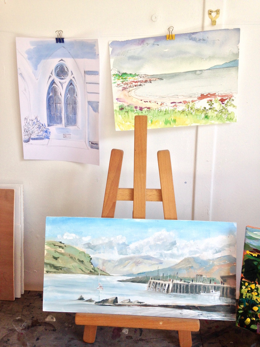 Ah, Millport! I’ve long since wanted to return since breaking my collarbone on my last visit. On our way into the town, Marion and I spotted plenty of places for an artist to drop anchor with their paint pots. But we were making our way to the Cathedral of the Isles where the Studio Gallery nestles in its shady environs.