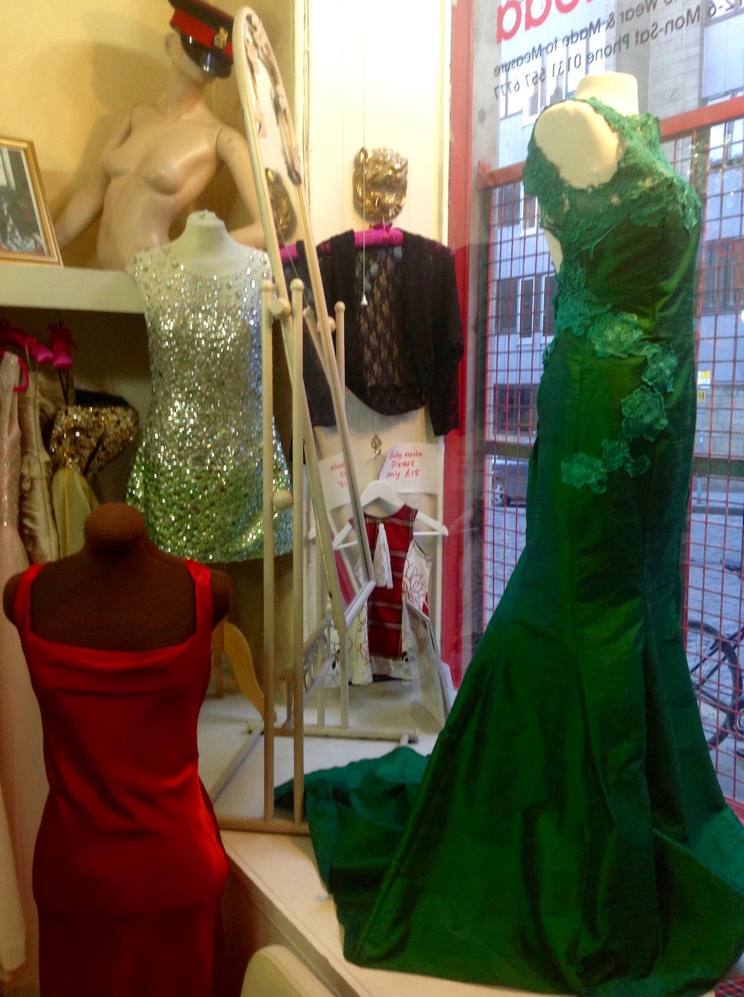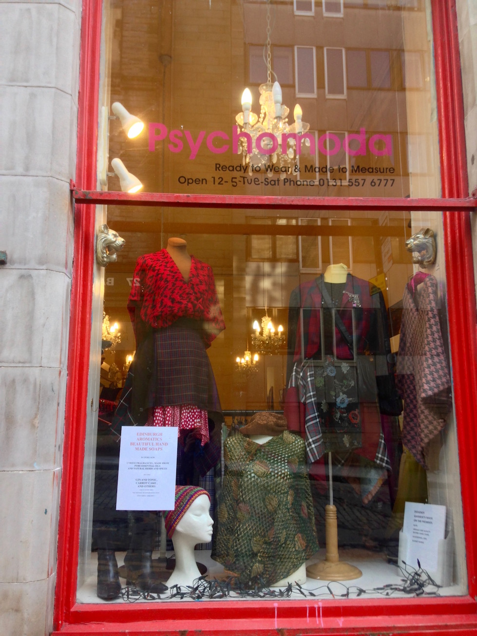 Fab independent shops galore! First of all we popped in to see old pal Alison, whose Psychomoda boutique is on St. Mary’s Street near the Royal Mile. Alison shared a flat with a friend when they were at Edinburgh College of Art. I remember her being up with the lark to work on her fashion course assignments. So it’s no wonder her business flourished. Cheating another wee bit because the green dress photo is from a couple of years back. Everything in the store is Alison’s own creation, including the handmade soap.