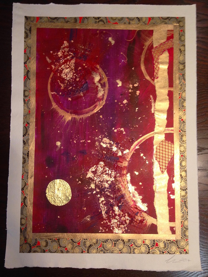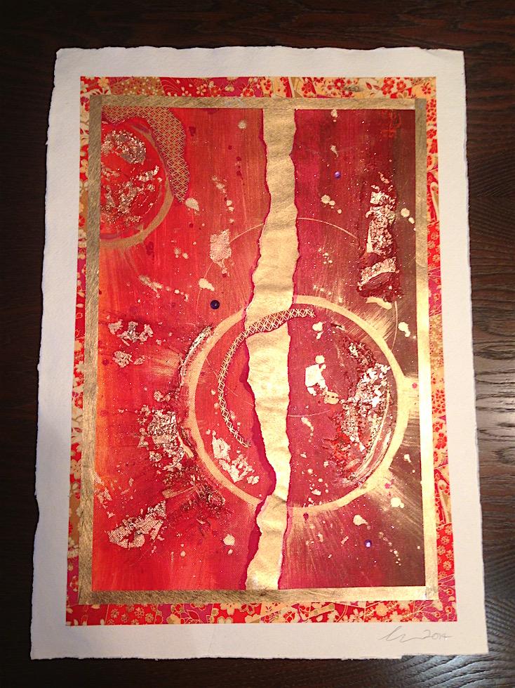A few years back I sold one of my favourite paintings, a bright pink affair called Happy New Year! which conjures up fireworks, chiyogami and gold leaf. Later on the customer asked me to make pieces akin to my cards as I’d included a few in her purchase. I suggested loosely basing them on the four seasons. You can see two of them below, though they’re not the greatest photos. Not only was I pretty pleased as punch, but she was too (much more important, of course!). I’ll certainly be adding more such works to my repertoire.