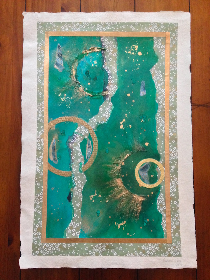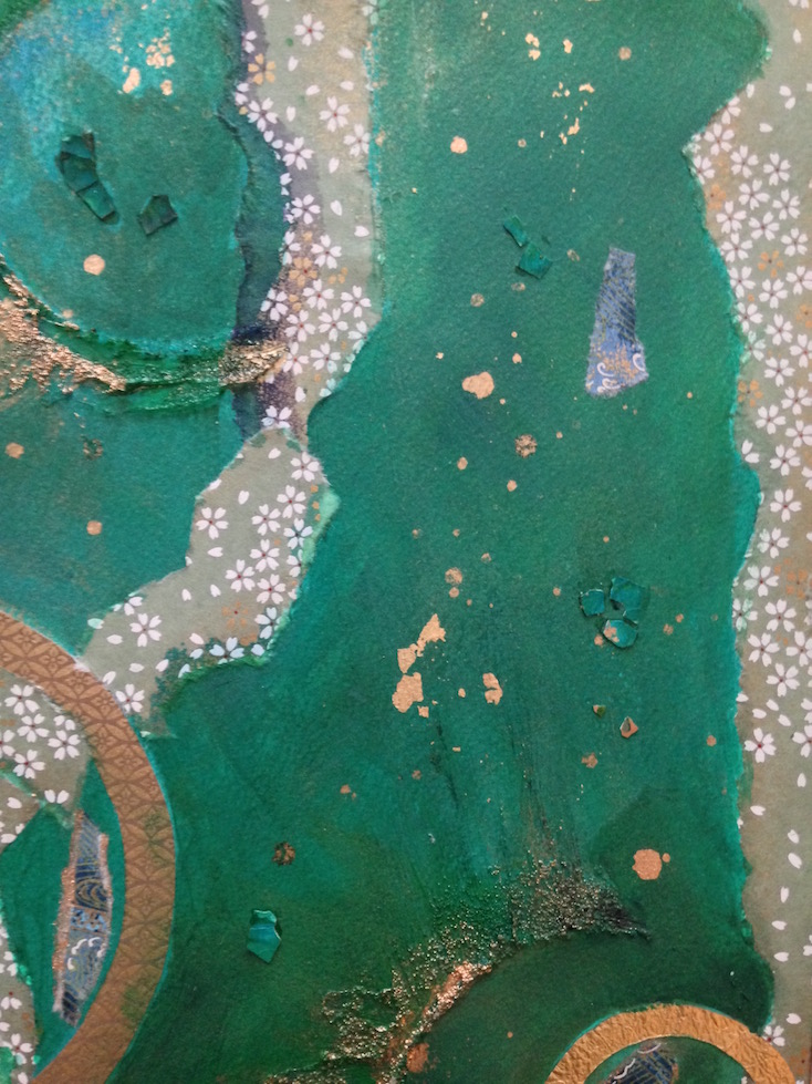 Detail of green chiyogami paper abstract painting by Emerald Dunne Art.