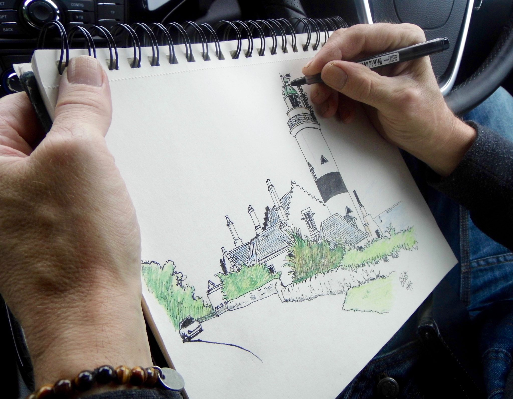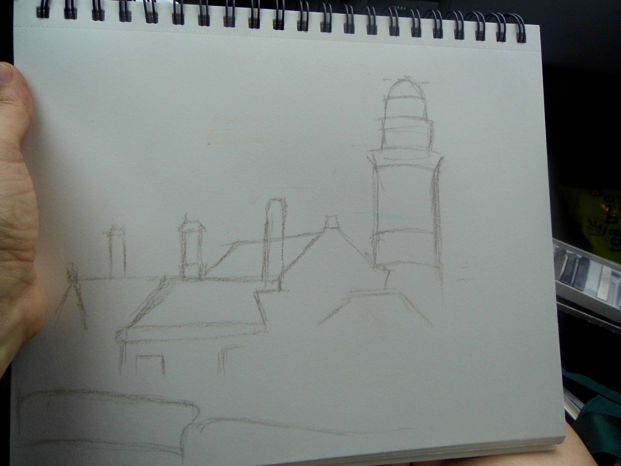 Take a look at the Cloch lighthouse near Gourock on the Firth of Clyde, while the mist was swirling outside the comfort of our car. You can also see it in the photo below on a gentle spring evening when the opposite coast is clear to almost touch. Naturally we were hoping for that kind of day to come and sketch, but we have to work with what you have.