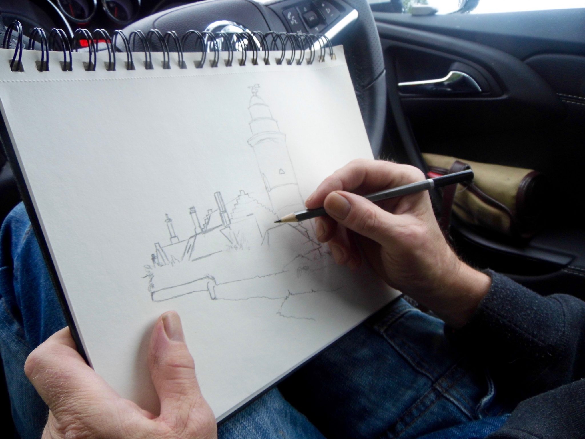 Yikes, buildings! Admittedly, I was a bit apprehensive about sketching this beautiful building as I’m much happier doing land or seascapes. No such fear with Stephen who has a knack of capturing all kinds of man-made structures. Just imagine lots of boxes, he said. Keep the lines and angles correct and everything in scale from the start. Use every roof and window to help you measure distances. Once you’ve achieved this then the perspective falls into place. He’s certainly got a talent for such pieces. Another Scottish artist friend once asked him if he’d ever done any architectural drawing.
